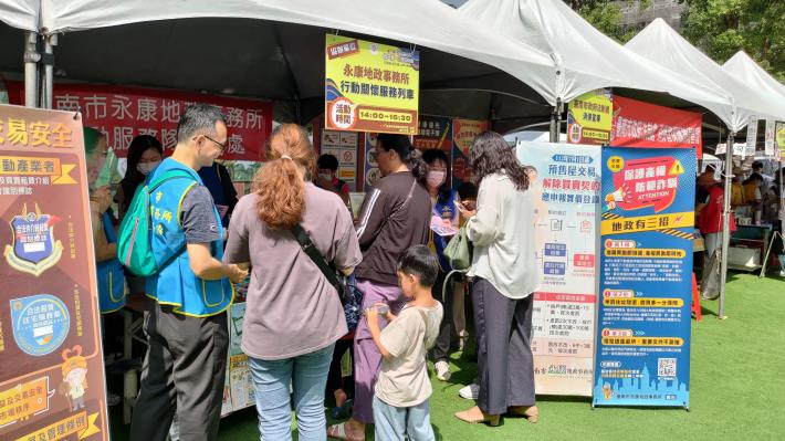 為強化不動產防詐與交易安全宣導,臺南市永康地政事務所主動出擊,於9月20日啟動「地政行動服務列車」,首度駛入南紡購物中心廣場,結合市政府財政稅務局新化分局舉辦「幸福稅月」租稅宣導,以寓教於樂的方式,向市民大力推廣實用的「地政防詐三寶」,希望能提升市民的識詐能力,共同守護市民的財產安全。此次活動現場人潮眾多,永康地政透過生動有趣的互動問答,搭配地政業務宣導小物及文宣品,讓生硬的法規知識變得淺顯易懂,吸引許多民眾大手拉小手一起來駐足參與。民眾紛紛表示,這場活動不僅學到了防詐新知,對地政業務也有了更深入的了解,深富意義。