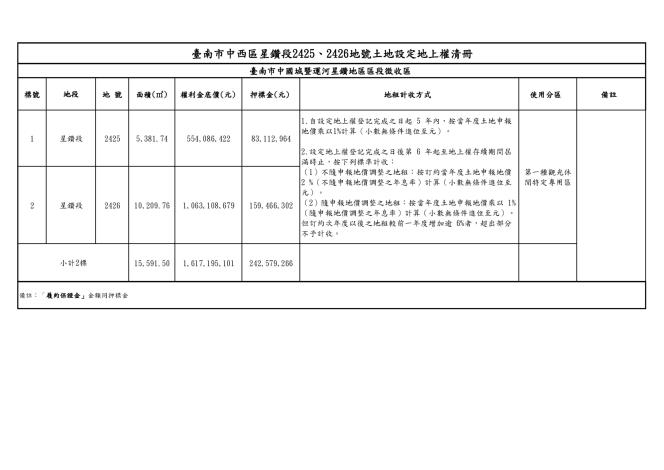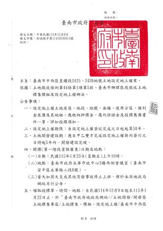 臺南市政府114年12月8日府地徵字第1141653591A號公告「臺南市中西區星鑽段2425、2426地號土地設定地上權案」。