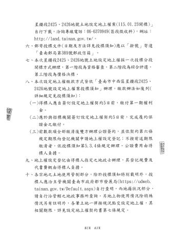 臺南市政府114年12月8日府地徵字第1141653591A號公告「臺南市中西區星鑽段2425、2426地號土地設定地上權案」。投標訊息及相關資料請至「臺南市政府地政局網站/土地開發/開發區土地標售專區/土地標售、標租、設定地上權/臺南市中西區星鑽段2425、2426地號土地設定地上權案 (115.01.23開標)」項下參閱,敬請把握良機,踴躍投標。