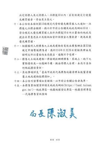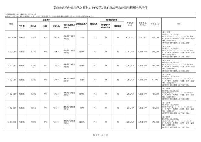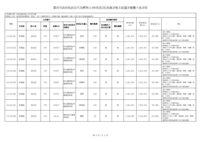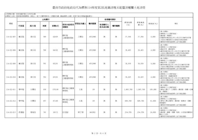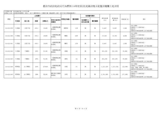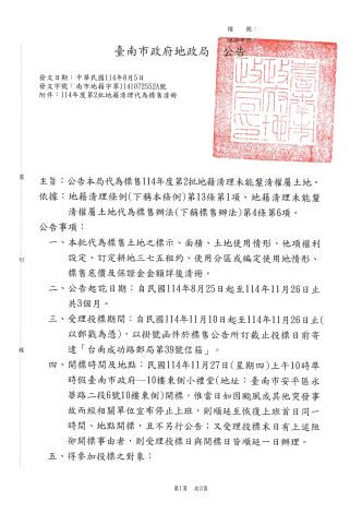 臺南市政府地政局114年8月5日南市地籍字第1141072552A號公告本局代為標售114年度第2批地籍清理未能釐清權屬土地,受理投標期間為自114年11月10日起至114年11月26日止(以郵戳為憑)。標售相關資訊可至「臺南市政府地政局網站/地政專區/地籍地權登記專區/地籍清理專區/代為標售資訊」項下查詢下載,歡迎符合資格而有意投標者把握良機,踴躍投標。