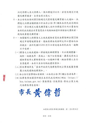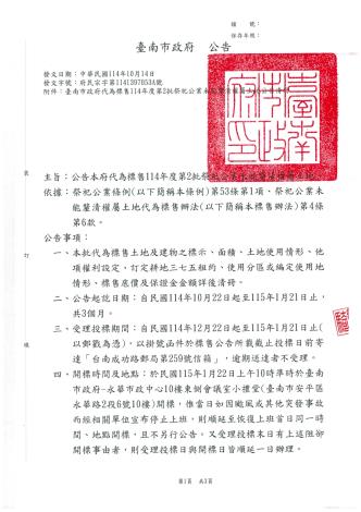 臺南市政府114年10月14日府民宗字第1141397053A號公告本府代為標售114年度第2批祭祀公業未能釐清權屬土地,受理投標時間:自民國114年12月22日至114年1月21日止(以郵戳為憑),相關資訊請逕至「臺南市政府民政局網站─業務專區-宗教專區-祭祀公業土地代為標售專區-代為標售公告」下載,歡迎踴躍投標。